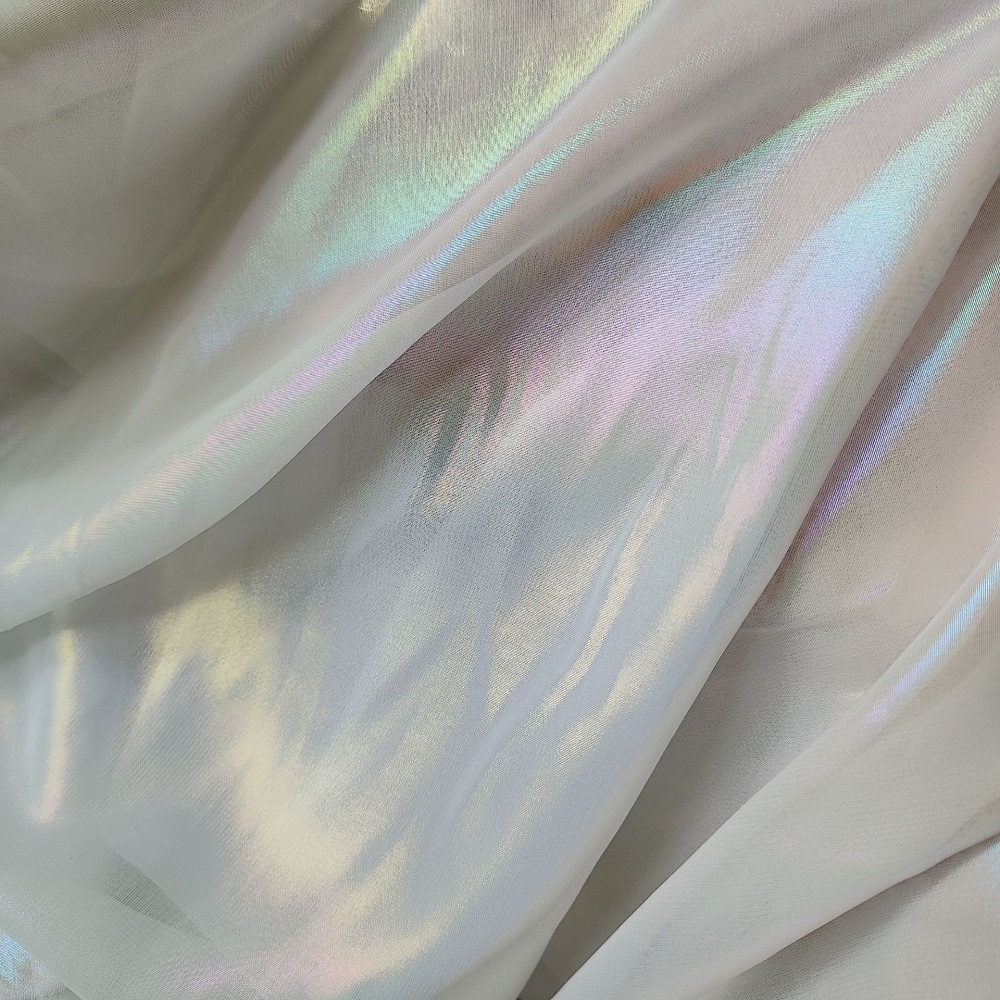 This colorful printed chiffon fabric with all-over foil features a lightweight, sheer polyester base enhanced with vibrant rainbow prints and shimmering foil accents. Its fluid drape and airy hand feel make it ideal for creating evening dresses, blouses, scarves, dancewear, and special event fashion. We offer 2 different styles: Rainbow Foil and Iridescent Foil.